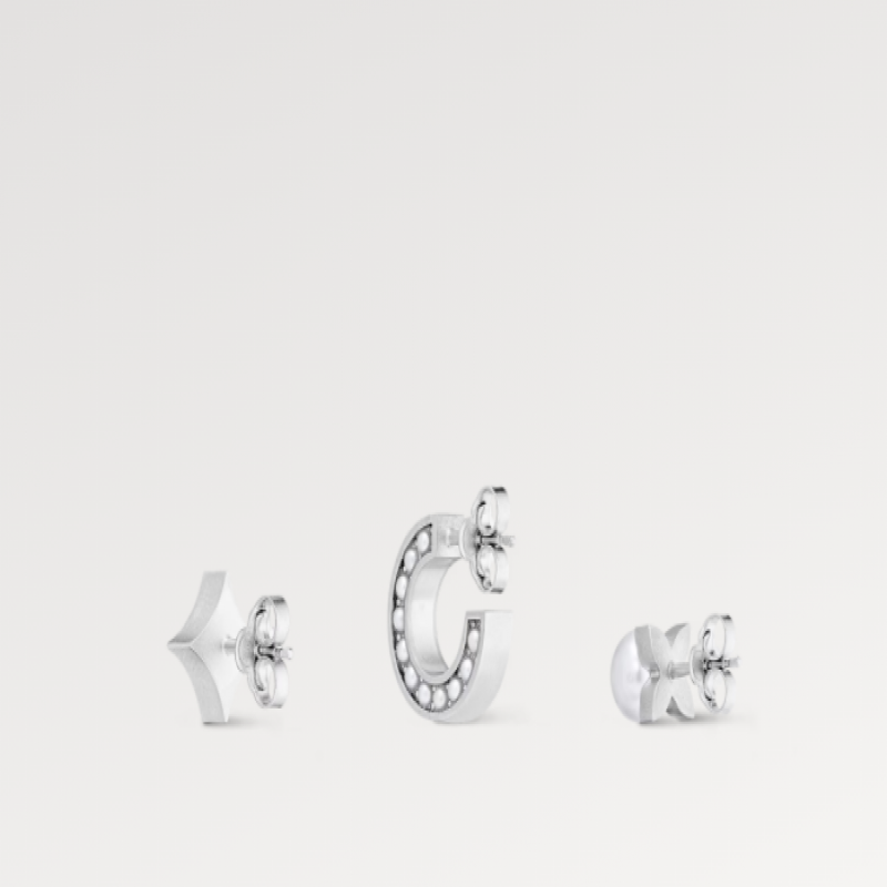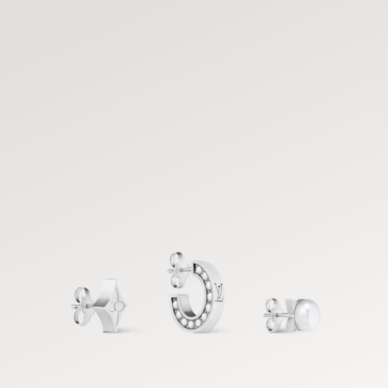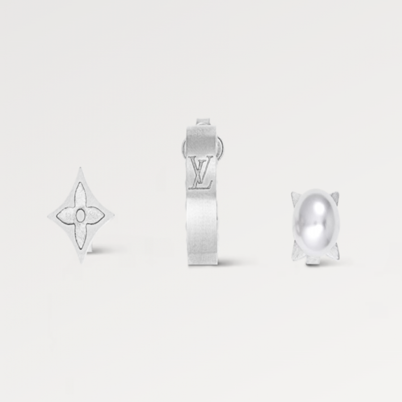 パールイヤリングセットは、モノグラム柄のフローラルスタッド、中央にレジンビーズがあしらわれたもの、またはLVパターンにレジンビーズを象嵌したフープなど、洗練された印象を与えるブラッシュ仕上げが施されています。単独で着用しても、重ね付けしても、どんなスタイルにもエッジの効いたアクセントをプラスしてくれます。