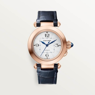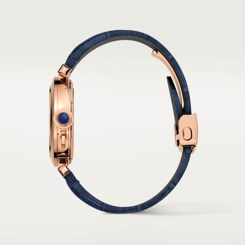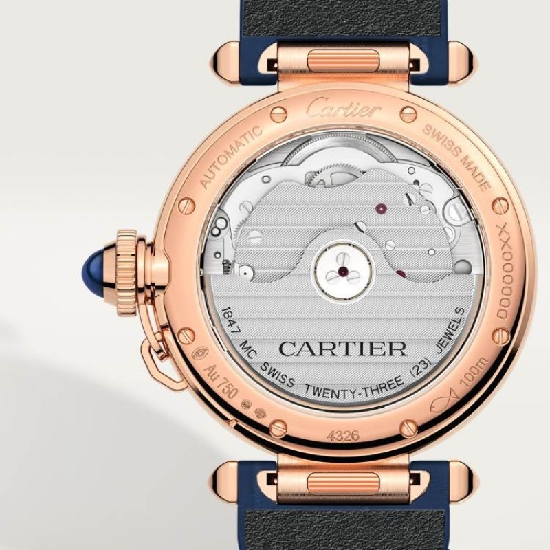 カルティエ パシャ ドゥ カルティエ ウォッチは、35mmサイズで、カルティエ自社製の自動巻き機械式ムーブメント「1847 MC」を搭載しています。750‰ローズゴールドケース、サファイアクリスタル付きねじ込み式リューズ、シルバーギョーシェダイヤル、ダイヤモンドキルティングを施したブルースチール針、クイックチェンジストラップシステムと交換可能な750‰ローズゴールド製フォールディングクラスプを備えたネイビーとグレーのアリゲーターレザーストラップが特徴です。ケース径:35mm、厚さ:9.37mm、10気圧防水(約100メートル)。