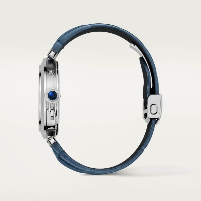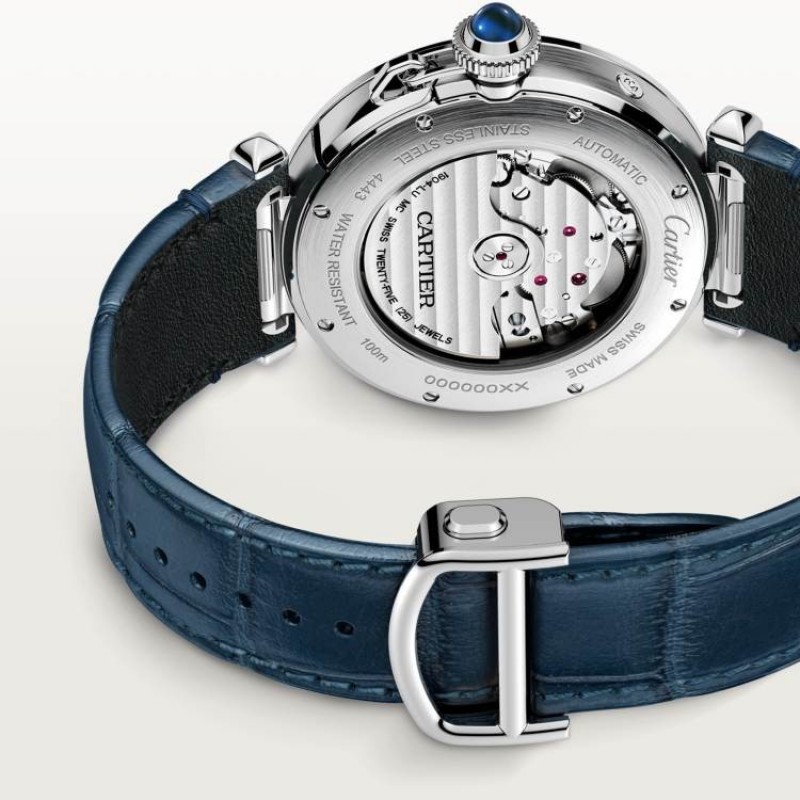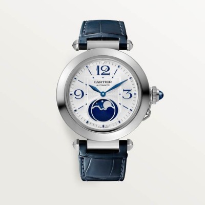 パシャ ドゥ カルティエ ムーンフェイズ ウォッチ(41mm)は、カルティエ自社製自動巻き機械式ムーブメント1904-LU MCを搭載しています。ステンレススチール製ケース、スピネルをセットしたフルーテッドリューズ、シルバーのギョーシェダイヤル、ブルースチール針、ブルーのアリゲーターレザーストラップ(グレーのアリゲーターレザーストラップも付属)、交換可能なステンレススチール製フォールディングクラスプを備えています。ブレスレットとストラップの両方に「QUICKSWITCH」クイックチェンジシステムを採用しています。ケース径:41mm、厚さ:9.55mm。6時位置にムーンフェイズ表示、サファイアクリスタル製ケースバック。10気圧防水(約100m)。