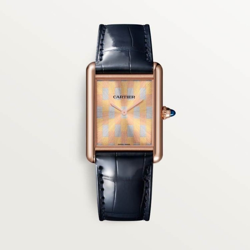 カルティエ自社製、手巻き式機械式ムーブメント。750/1000ローズゴールドケース、カボションカットサファイアをセットしたビーズ装飾のリューズ。サテン仕上げのトリゴールドダイヤル、剣型の金メッキステンレススチール針、ミネラルクリスタル風防。750/1000ローズゴールドのピンバックル付き、高光沢ネイビーブルーのアリゲーターレザーストラップ。ケースサイズ:33.7 x 25.5 mm。厚さ:6.6 mm。3気圧防水(約30メートル/100フィート)。