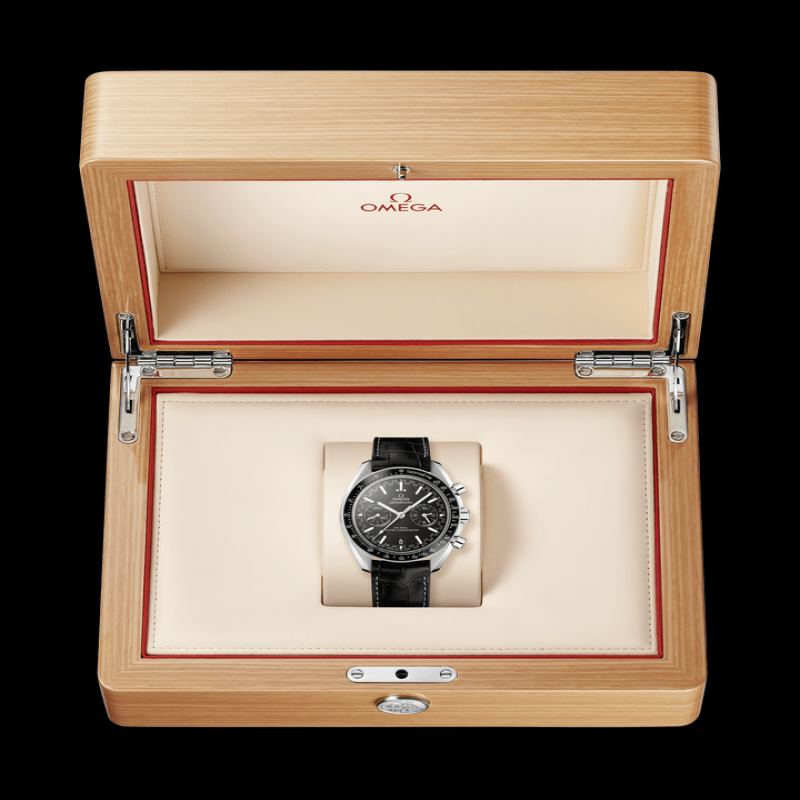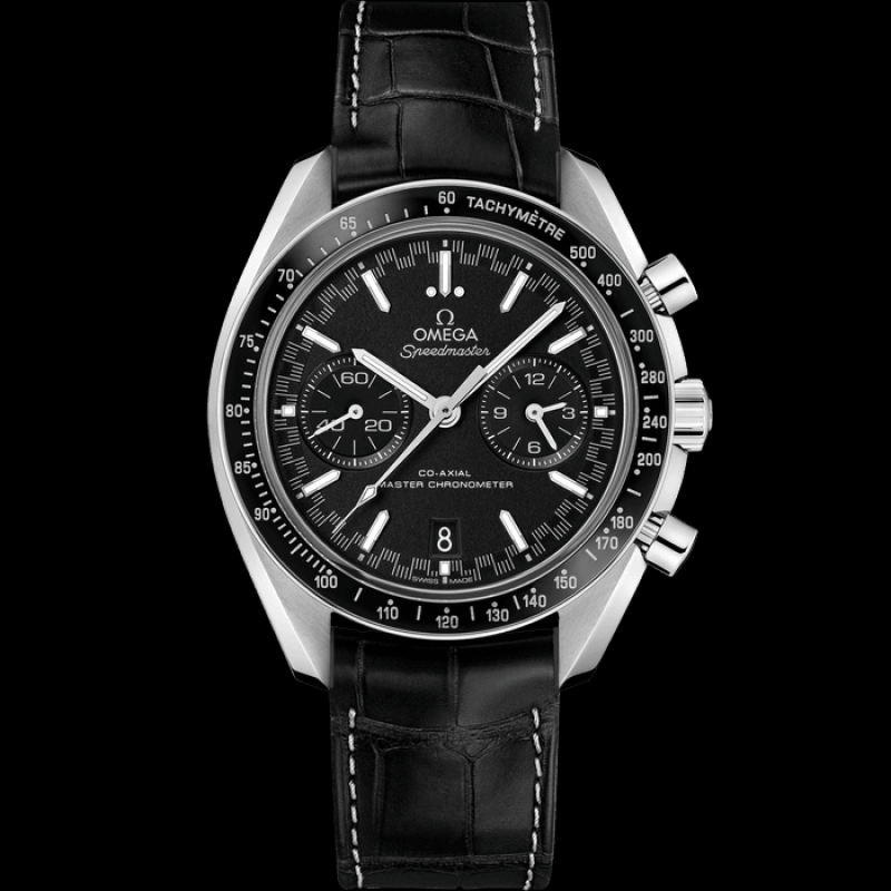 スピードマスター レーシング クロノグラフ 44.25mm、ステンレススチールケース、レザーストラップ。