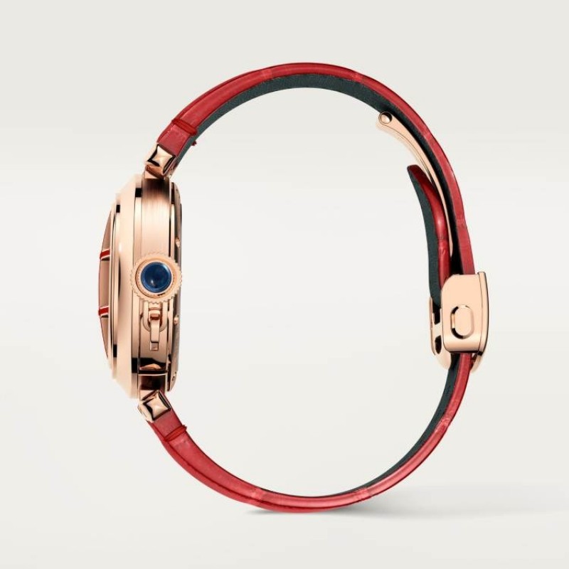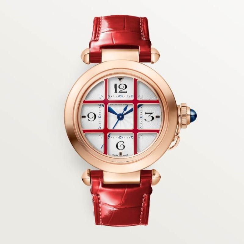 パシャ ドゥ カルティエ ウォッチ(35mm)は、カルティエ自社製自動巻き機械式ムーブメント「1847 MC」を搭載しています。750/1000ローズゴールド製のケースには、取り外し可能な750/1000ローズゴールド製のグリル、レッドラッカー仕上げ、サファイアクリスタル付きねじ込み式リューズ、シルバーのギョーシェ彫りダイヤル、ダイヤモンドキルティングを施したブルースチール針を備えています。レッドとブルーのアリゲーターレザーストラップがそれぞれ1本ずつ付属し、どちらもクイックスイッチ式クイックチェンジシステムを採用しています。また、750/1000ローズゴールド製の交換可能なフォールディングクラスプも備えています。ケースサイズ:35mm、厚さ:12.7mm。10気圧防水(約100メートル)。