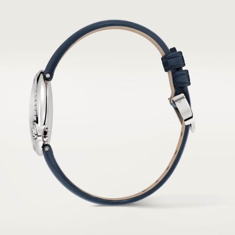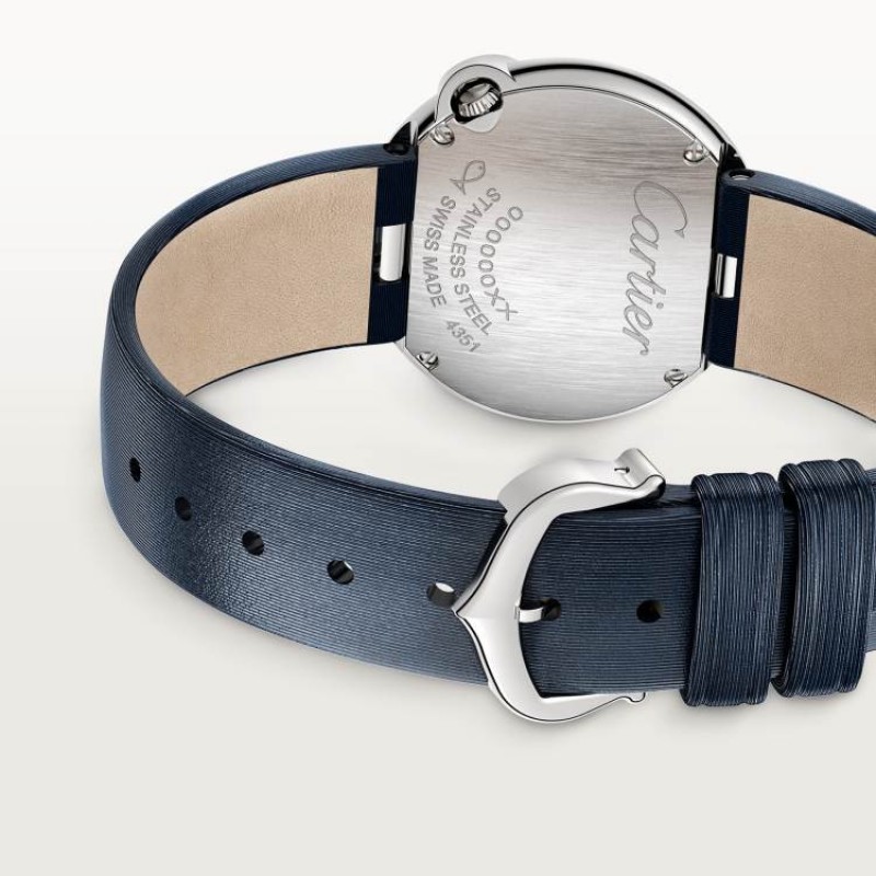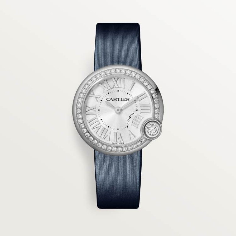 カルティエ バロン ブラン ウォッチ、30mm、クォーツムーブメント。ステンレススチールケース、4時位置にダイヤモンドのアワーマーカー、合計0.66カラットのブリリアントカットラウンドダイヤモンド44個をセッティング。サンレイ仕上げのシルバーダイヤル。剣型の針。サファイアクリスタル。ステンレススチール製ピンバックル付きカーフスキンストラップ。ケース厚:8.54mm。3気圧防水(約30メートル)。