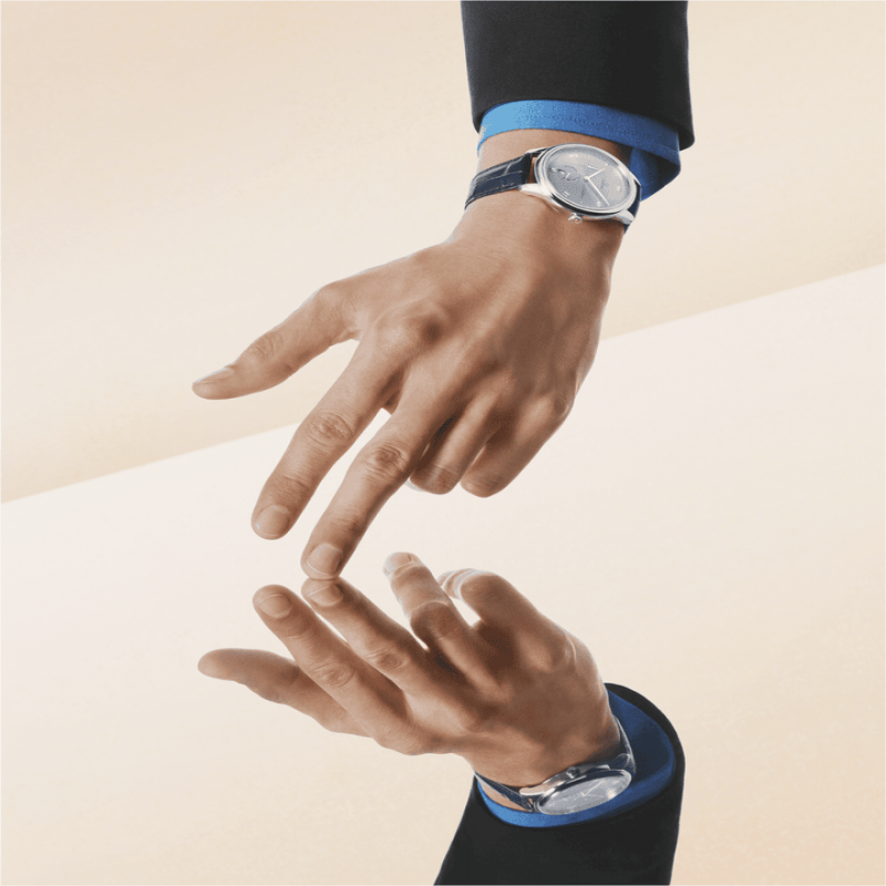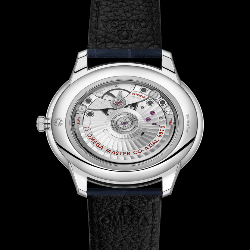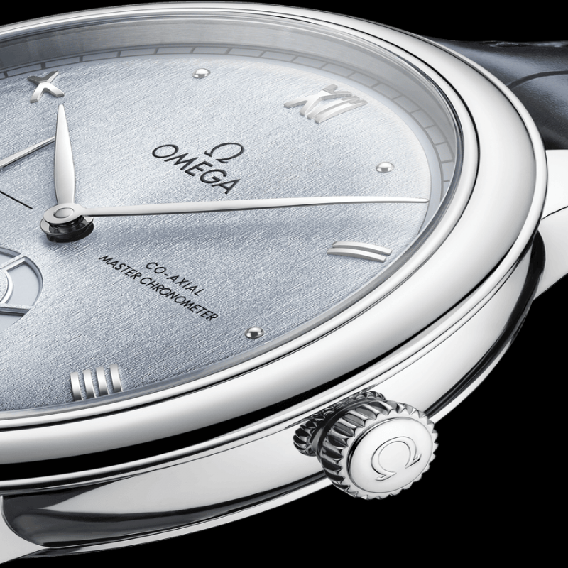 サファイアクリスタル:時計の精緻なディテールをより美しく鑑賞していただくために、オメガは傷がつきにくく反射防止加工を施したサファイアクリスタルを採用しています。サファイアクリスタルは、加工・仕上げの前に、ヴェルナー法(フレームフュージョン法とも呼ばれる)を用いて製造されます。この製法では、水素酸素炎を用いて原料を溶融し、溶融した液滴を円筒状に結晶化させます。モース硬度9(1~10段階)を誇るこのサファイアクリスタルは、極めて傷がつきにくく、非常に硬く、常に優れた視認性を確保します。
