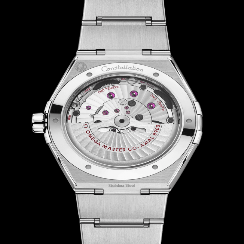 ムーブメント:オメガ8900自動巻きコーアクシャルムーブメント。スイス連邦計量研究所(METAS)認定のマスタークロノメータームーブメントで、15,000ガウスまでの磁場に耐えます。シリコン製ヒゲゼンマイを備えたフリースプラングテンプ、直列接続された2つの香箱、双方向自動巻き機構を搭載。タイムゾーン機能付き。ロジウムメッキのローターとブリッジは、特別な高級仕上げが施され、アラビア風のジュネーブストライプで装飾されています。パワーリザーブ:60時間