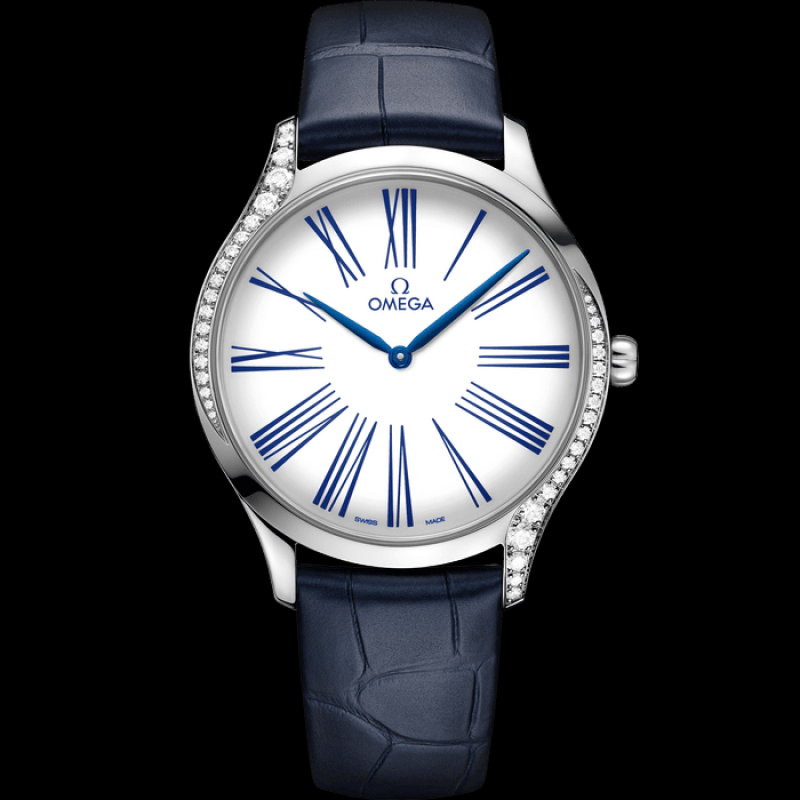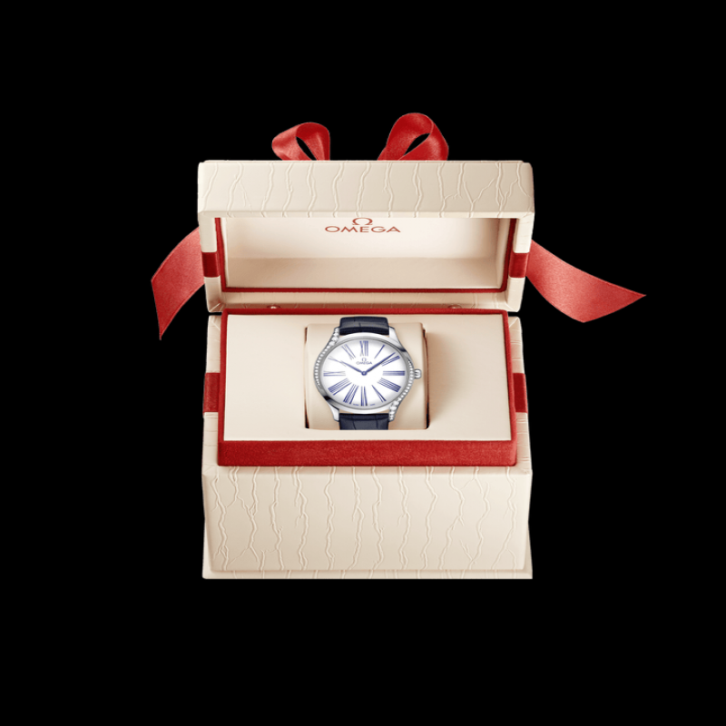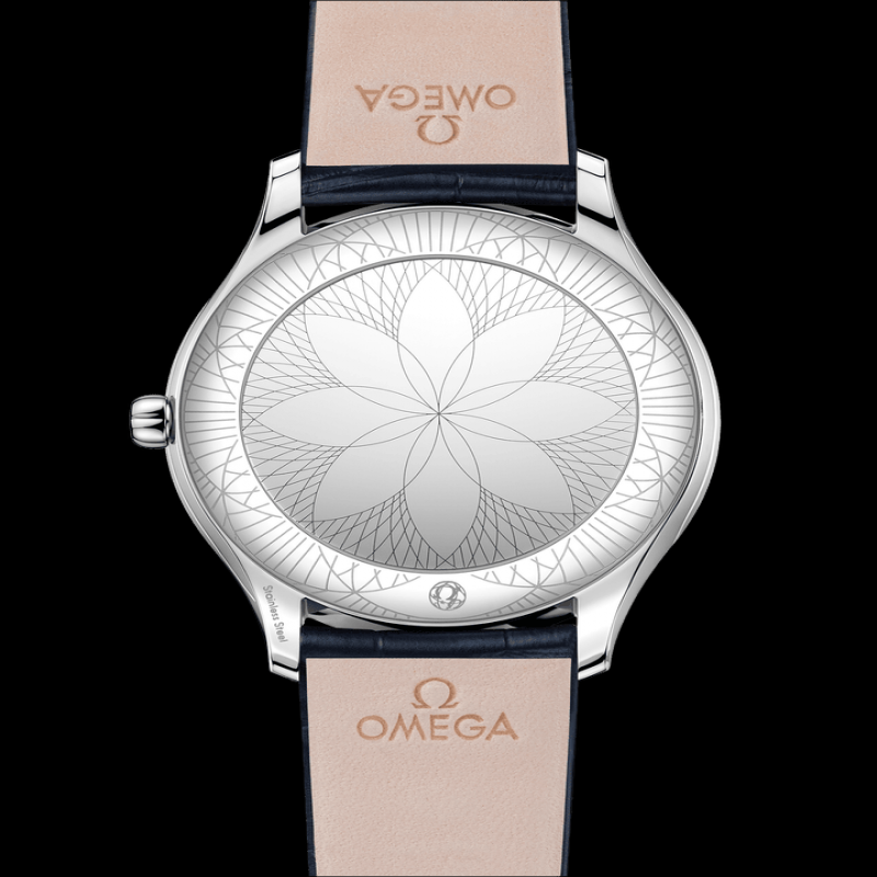 ムーブメント: オメガ 4061 クォーツ ムーブメント。電池寿命を最大限に延ばす「ロングラスティング」性能を備えています。特徴的な赤いオメガ ロゴ、ロジウムメッキ部品、スパイラル仕上げが特徴です。電池寿命: 48 か月。クリスタル: ドーム型、傷防止サファイア クリスタル、反射防止コーティング。防水性: 3 気圧 (30 メートル / 100 フィート)。ケースと文字盤: ケース: ステンレススチール。ケース直径: 39 mm。ラグ幅: 19 mm。ラグ間隔: 46.50 mm。厚さ: 9.8 mm。文字盤の色: ホワイト。総重量 (約): 55 g。ストラップ: ストラップの種類: レザー。ストラップの色: ブルー。ストラップの外側: アリゲーター レザー。ストラップの内側: ノン グレイン カーフスキン。クラスプの種類: ピン バックル。クラスプの材質: ステンレススチール。