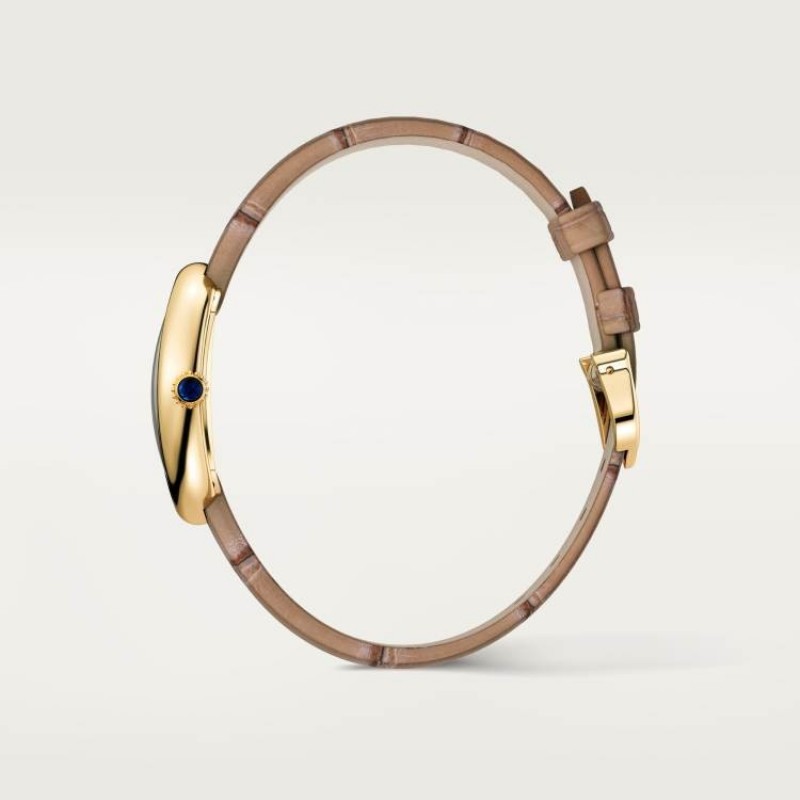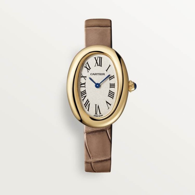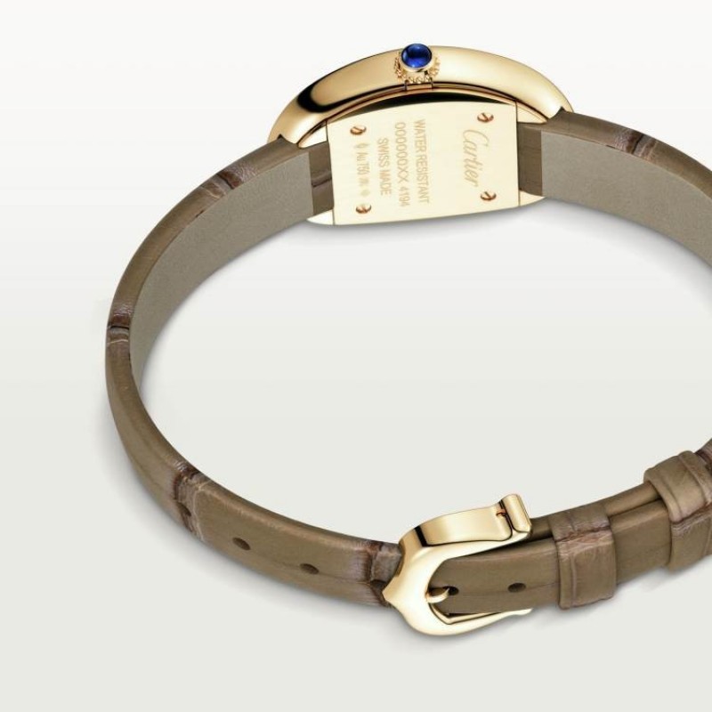 BAIGNOIRE ウォッチ、スモールモデル、クォーツムーブメント。750‰ゴールドケース。カボションサファイアをセットした750‰ゴールドビーズリューズ。シルバーダイヤル、ブルースチール製剣型針、サファイアクリスタル。750‰ゴールドピンバックル付きグレーアリゲーターレザーストラップ。ケースサイズ:31 x 23 mm。厚さ:7 mm。3気圧防水(約30メートル)。