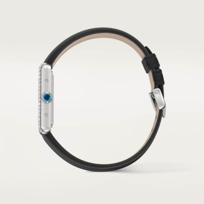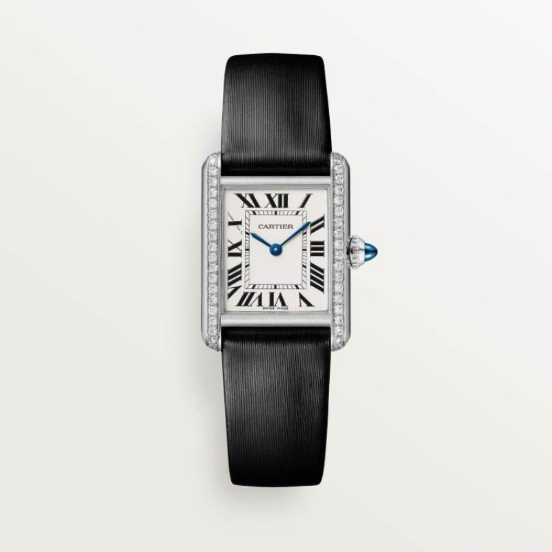 TANK MUST ウォッチ、小型モデル、クォーツムーブメント。ステンレススチールケース、ベゼルには合計0.39カラットのブリリアントカットラウンドダイヤモンド40個、ビーズ状のリューズにはカボションスピネル、シルバーダイヤル、ブルースチール製の剣型針、ブラックのスエードカーフスキンストラップ、ステンレススチール製ピンバックル。ケースサイズ:27mm x 22mm、厚さ:6.6mm。3気圧防水(約30メートル)。