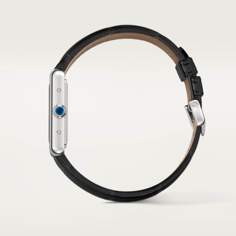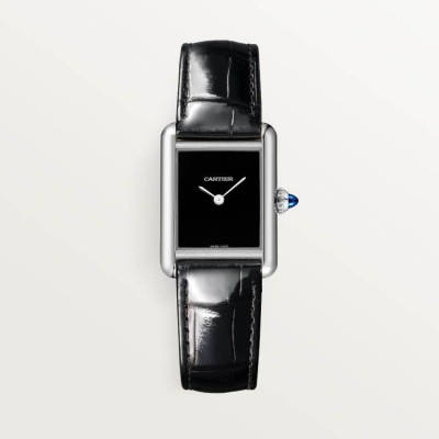 TANK MUST ウォッチ、小型モデル、クォーツムーブメント。ステンレススチールケース、カボションスピネルをセットしたビーズ状のリューズ、ブラックラッカー仕上げの文字盤、ロジウムメッキの剣型針、光沢のあるブラックアリゲーターレザーストラップ、ステンレススチール製ピンバックル。ケースサイズ:29.5mm x 22mm。厚さ:6.6mm。3気圧防水(約30メートル)。