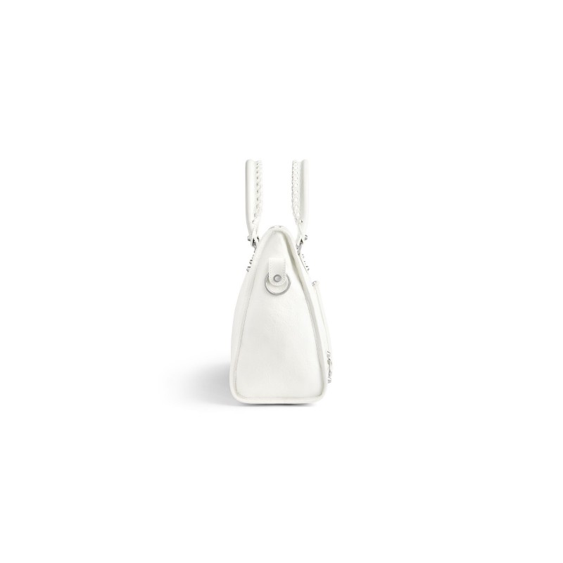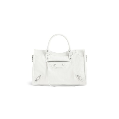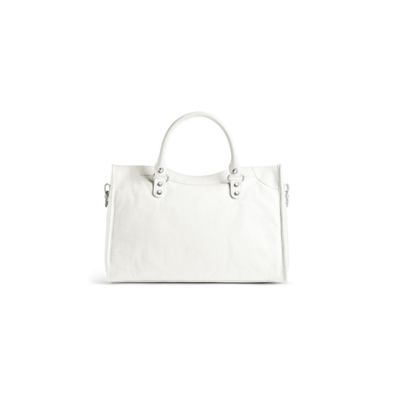 白いきめ細やかなラムスキンレザーを使用した、ミディアムサイズの「ル・シティ」ハンドバッグ。光沢のあるシルバーの金具があしらわれています。