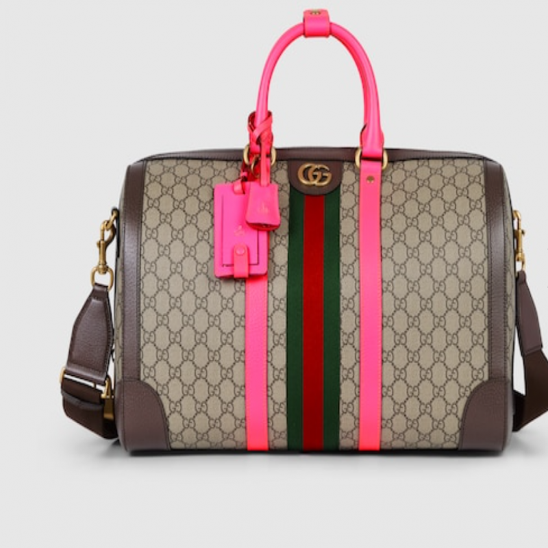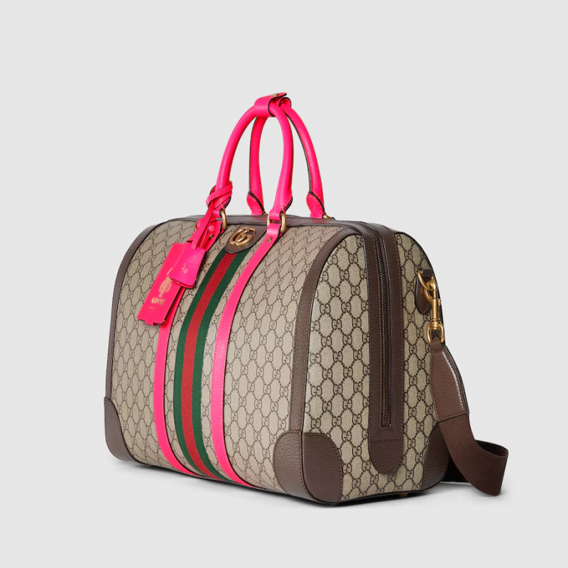 ベージュとエボニーのGGスプリームキャンバス、マゼンタとブラウンのレザーパイピング、ゴールドトーンの金具、レッドとグリーンのウェビング、コットンリネン混紡の裏地、ダブルGロゴ、取り外し可能なキーリング、ロック、新しいパーソナライズされた荷物取扱者識別タグ、内側:ジップポケット2つ、ハンドル(高さ12cm)、調節可能なキャンバスショルダーストラップ(高さ50cm)、ジップ開閉、容量:28リットル、寸法:幅44cm x 高さ28.5cm x 奥行き24.5cm、重量:約2.4kg、イタリア製。