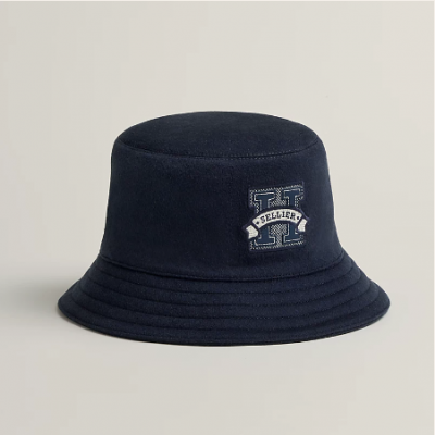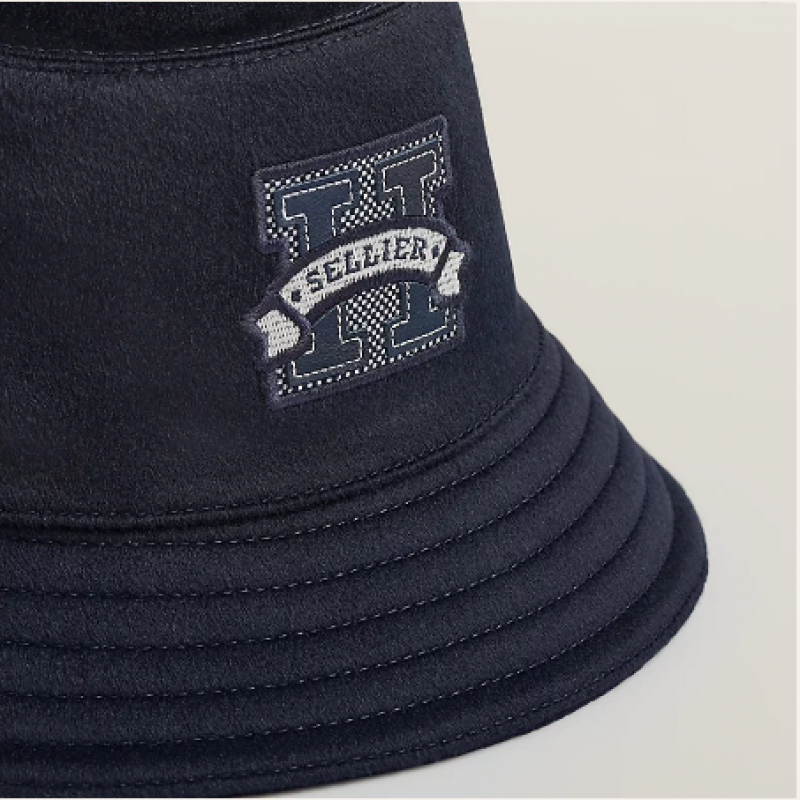 女性用カシミヤ製フィッシャーマンハット。フロントには「H Sellier」のHキャンバスとSwiftカーフスキンバッジがあしらわれています。裏地は無地のシルクとレーヨンです。