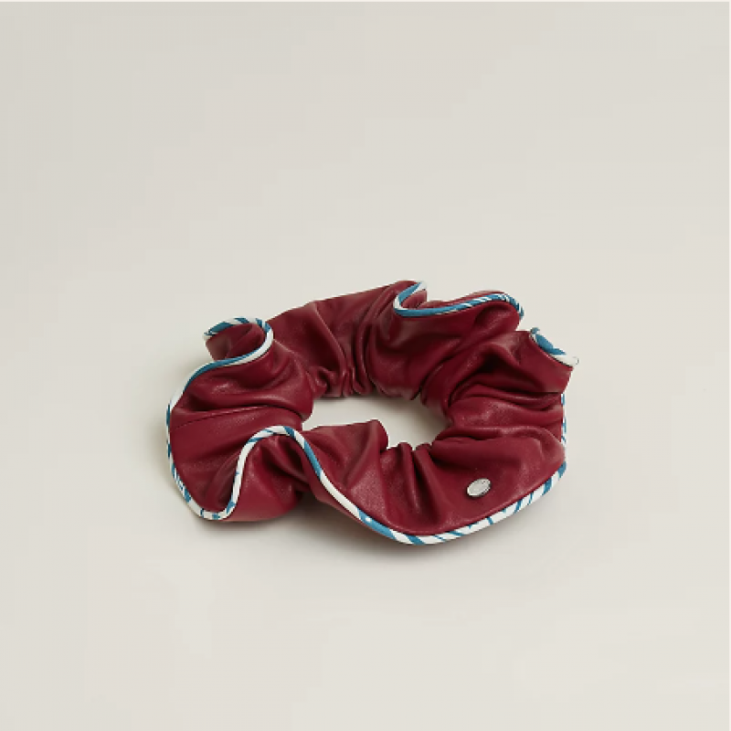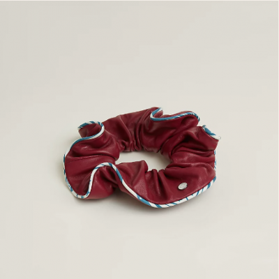 ナッパレザー調のラムスキン製ヘアタイ。ツイルシルクのパイピング、ジグザグ模様のサドルバンドターバン柄、そして光沢のあるパラジウムメッキのサドルスタッズがあしらわれています。