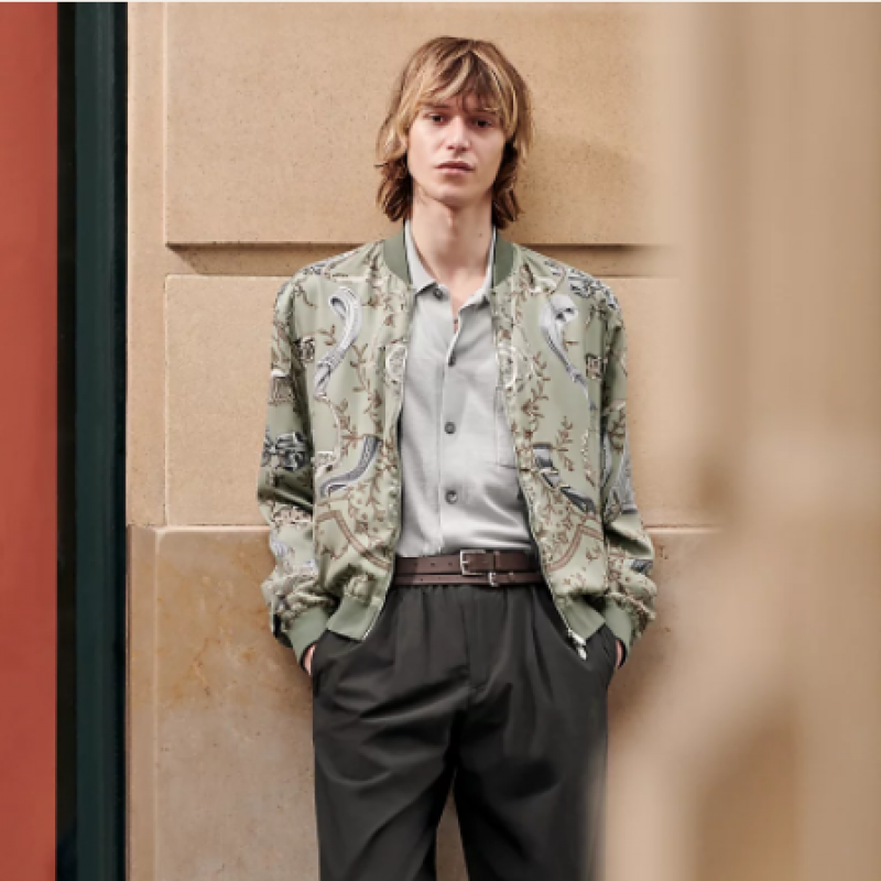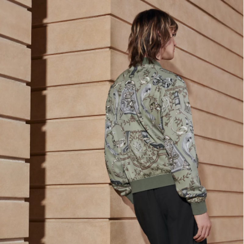 シルクとトワロヴァン(エルメス)のテクニカルスポーツファブリックを使用した、ストラップ付きダブルリブトリムジャケット(マルベリーシルク100%)。