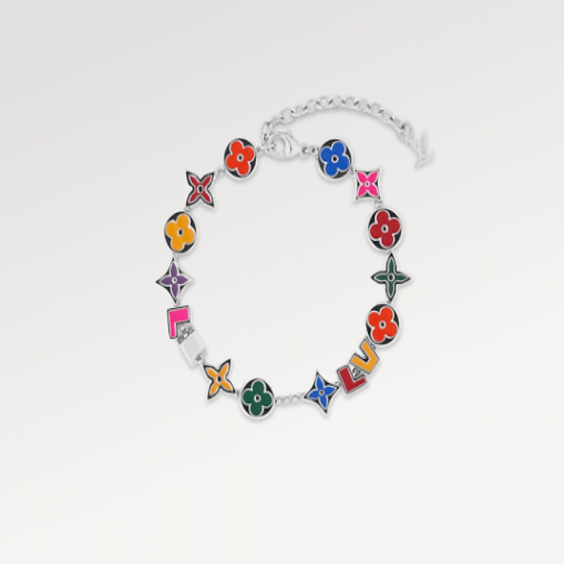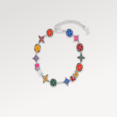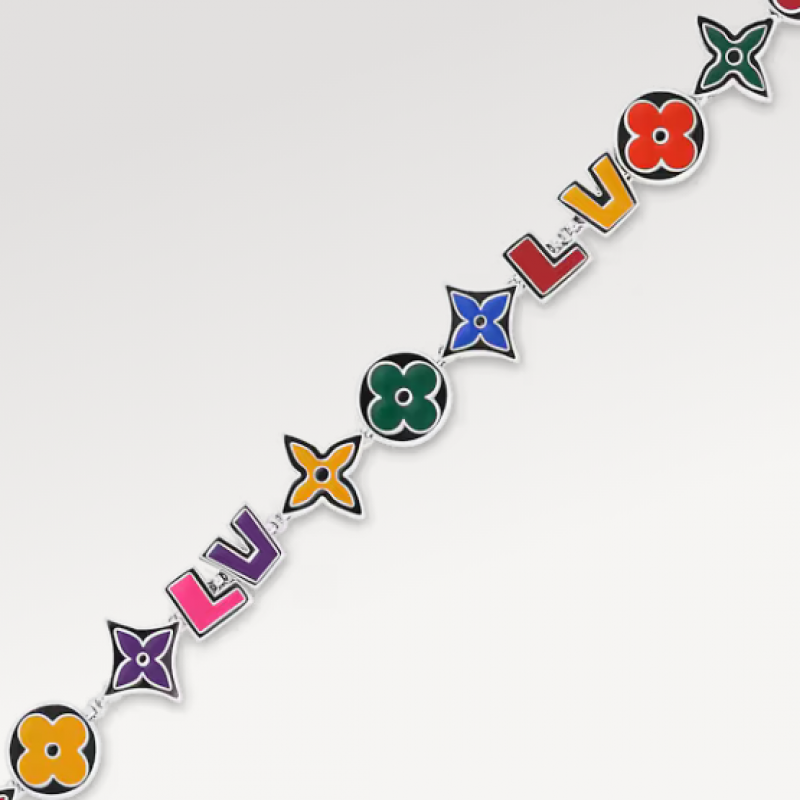 このモノグラム・パーティブレスレットは、鮮やかなカラーマニアカラーが特徴で、その華やかなスタイルで長い夏の日々を明るく彩ります。光沢のあるメタルにはエナメルのロゴが彫り込まれ、ルイ・ヴィトンの文字の間にはモノグラムフラワーが散りばめられています。チェーンにあしらわれたLVの文字が、この繊細なデザインを完成させています。