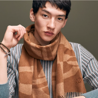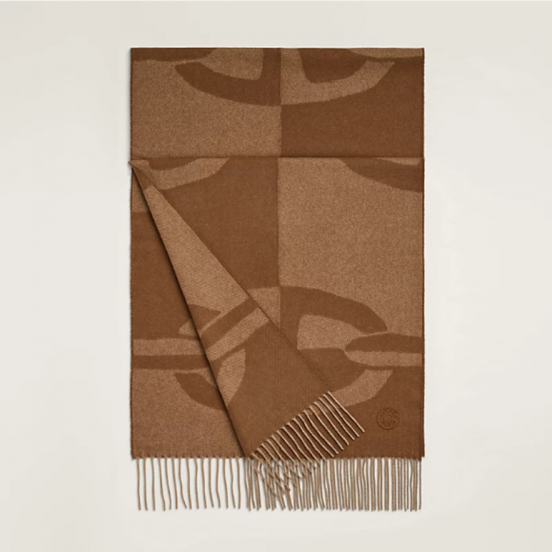 幾何学的な美しさを放つカラーブロックのシェーヌ・ダンクル柄に、サドルスタッズの刺繍がアクセントを添えたジャカード織りのスカーフです。