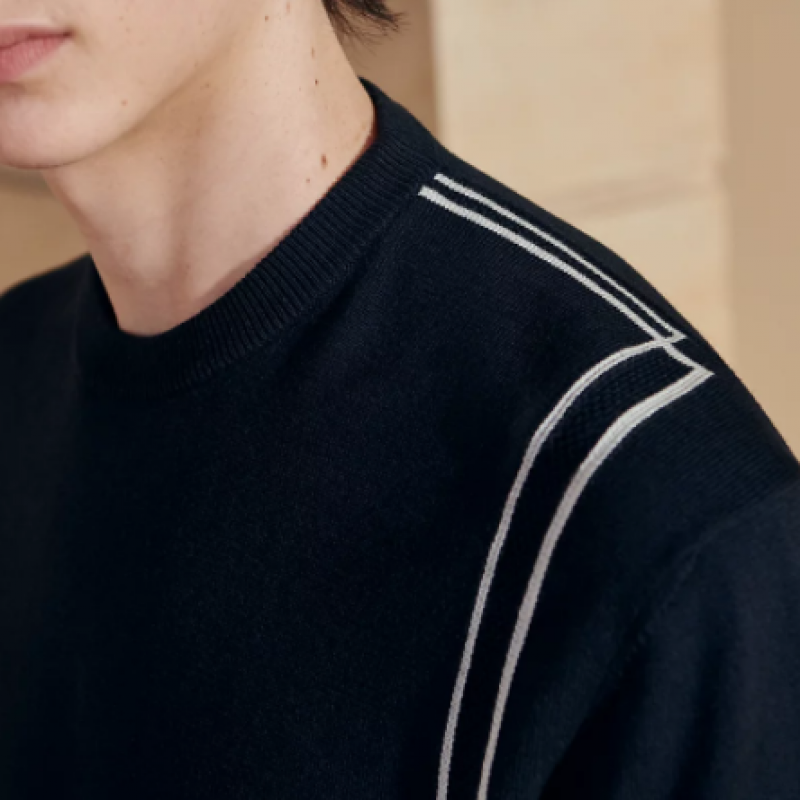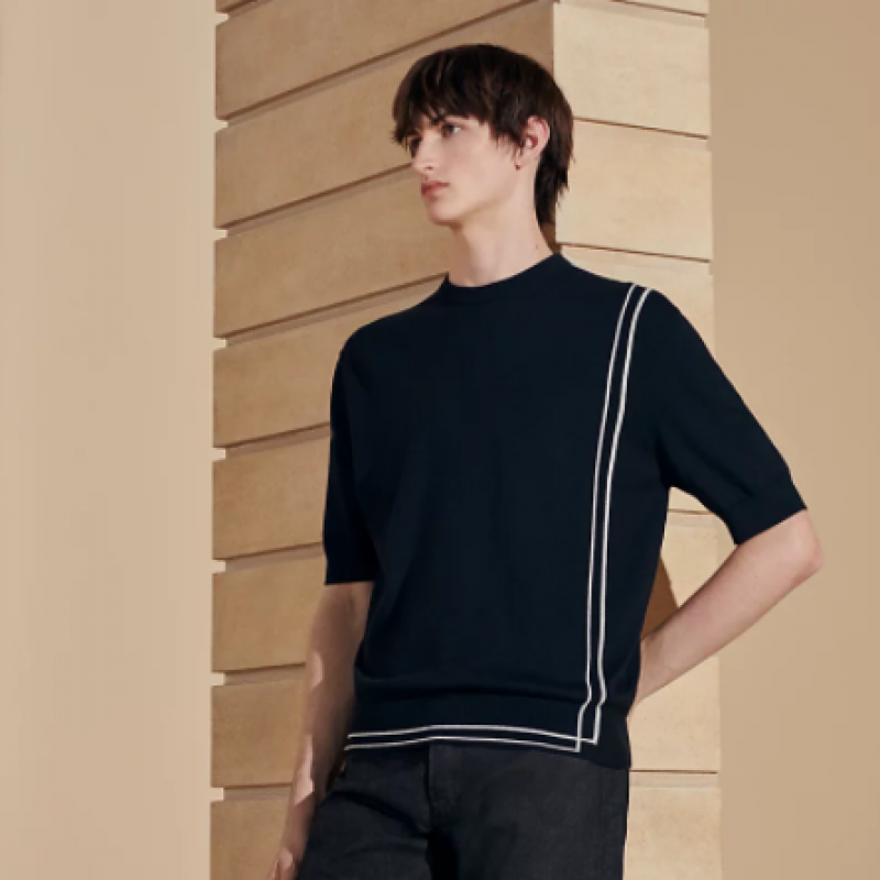 コットンカシミヤ混紡のクルーネック半袖Tシャツ。「Ligne graphique」のディテール入り(綿85%、カシミヤ15%)。